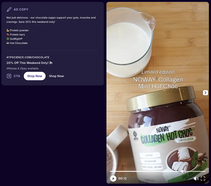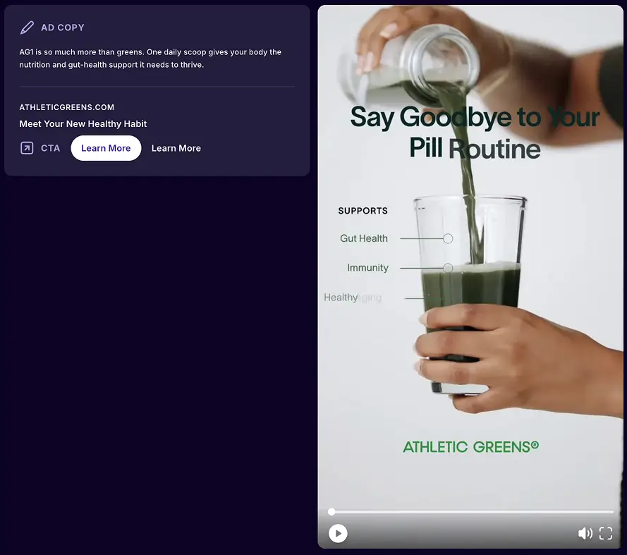 - In contrast, ATP Science stood out for the wrong reasons, its ads were 34 times more likely to be terminated on any day versus AG1. This may point to more frequent testing without a clear winning formula or an over-reliance on short-term promotions.