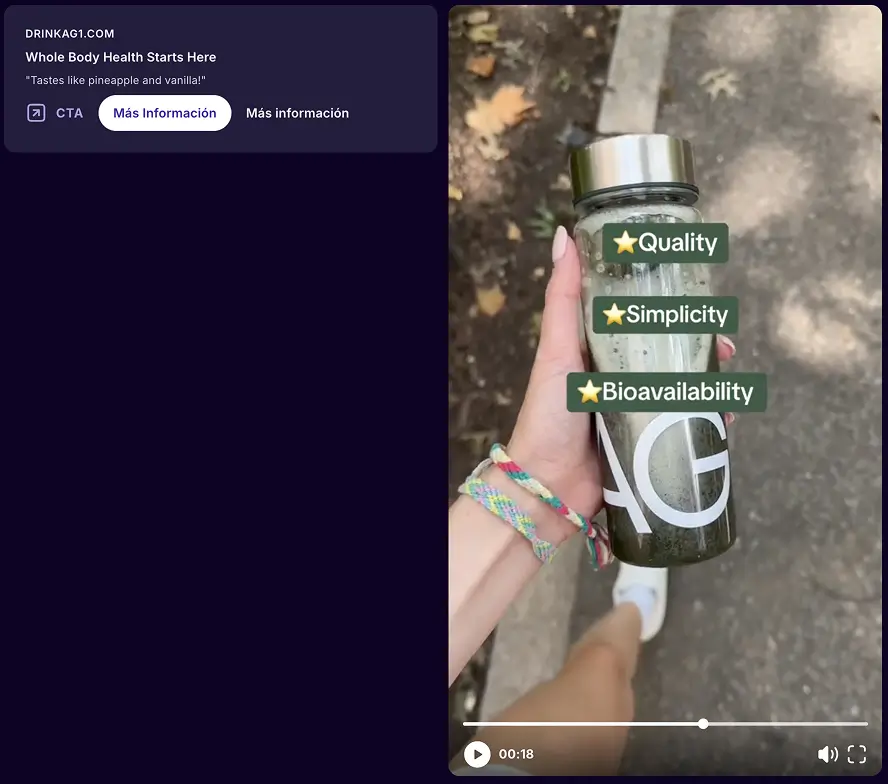 Single images accounted for 43.4% of all ad formats (217 ads), continuing to prove that simplicity and clarity still work in supplement advertising. Brands like AG1 and JSHealth heavily utilize static visuals to communicate benefits quickly and effectively, especially in retargeting scenarios.