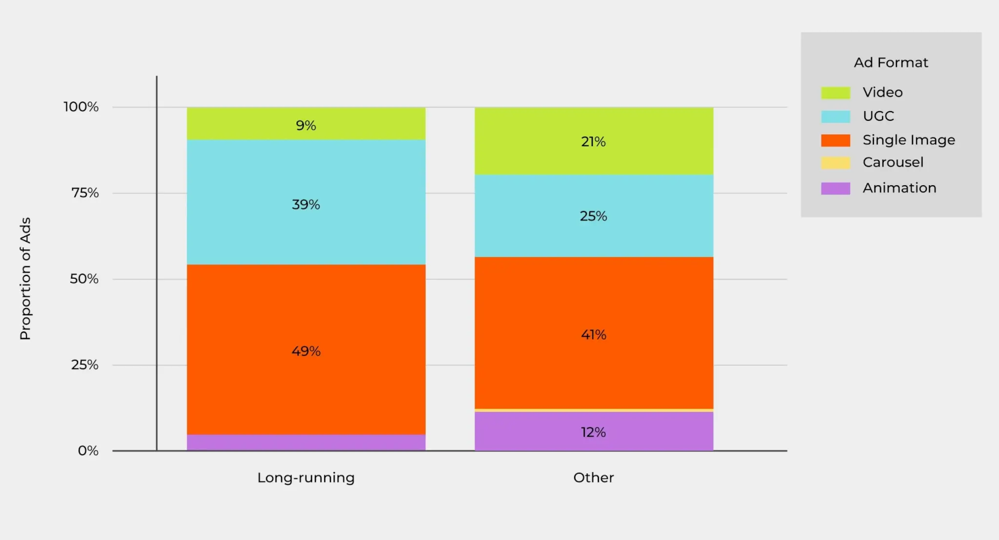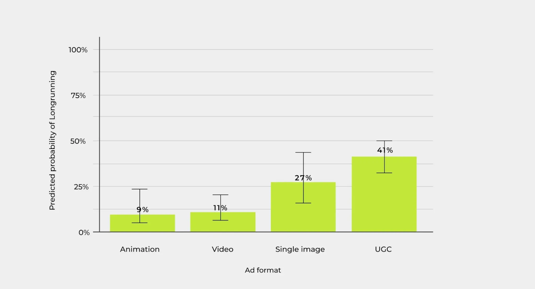 Format is key. Animation and video ads burn out fast (only ~ 10% chance of being long-running in both cases), while UGC ads stand out with a 41% probability of running much longer.
