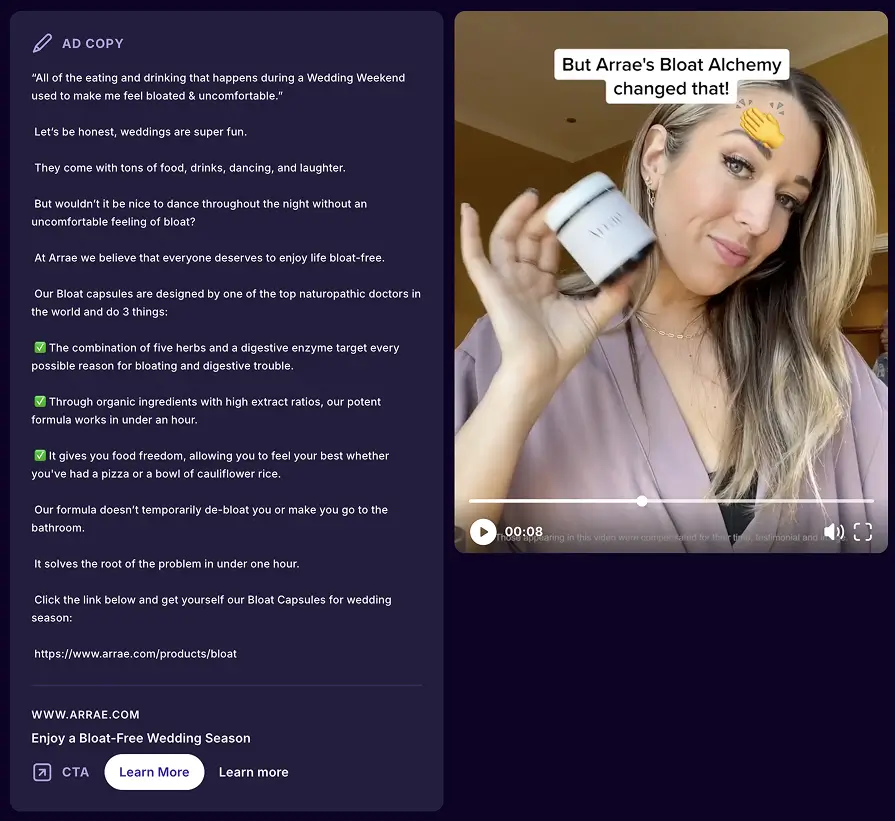 - Arrae demonstrated one of the strongest survival profiles, with a 67% lower risk of ad termination on any given day compared to AG1. Their campaigns are likely benefiting from strong positioning, consistent creative angles, and a narrow but well-optimized product offering. So definitely worth checking out their ads if you want a solid benchmark.