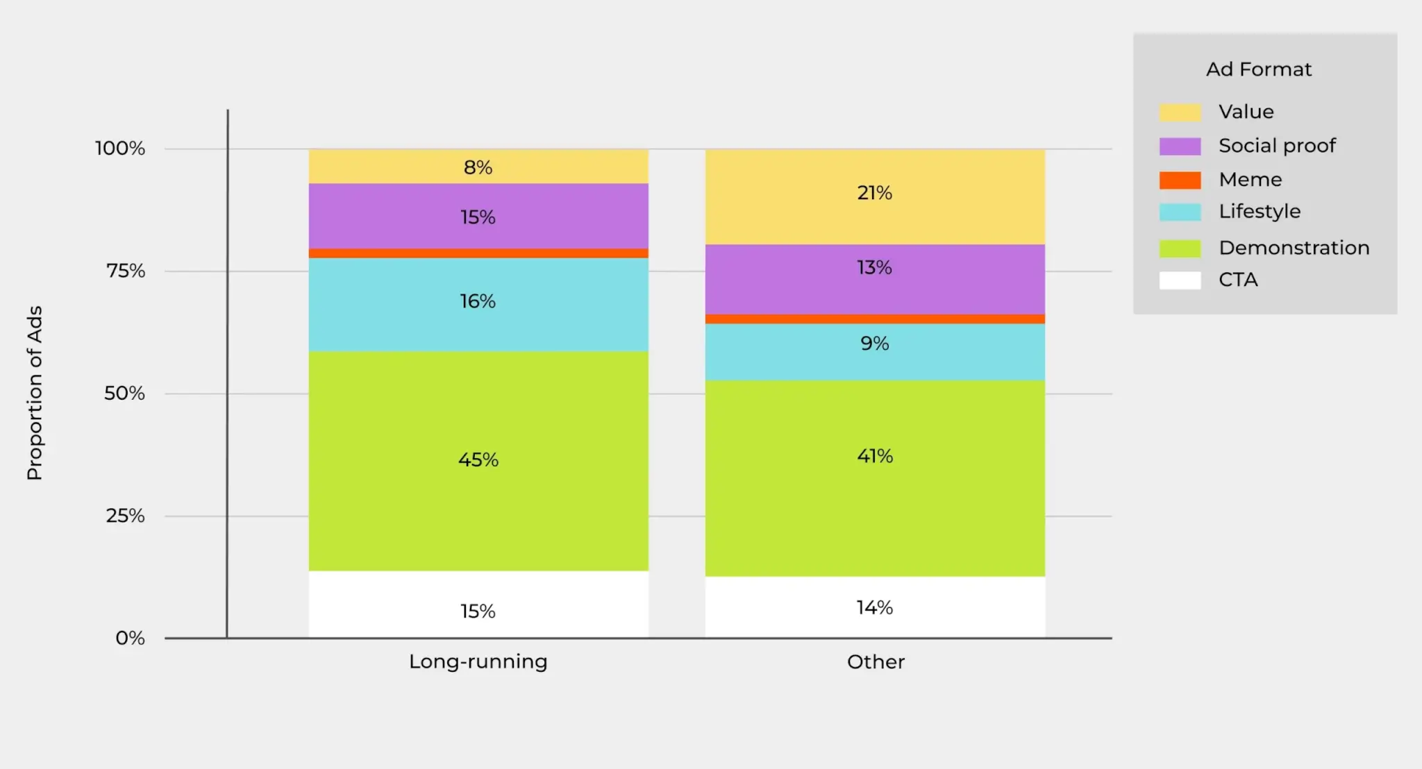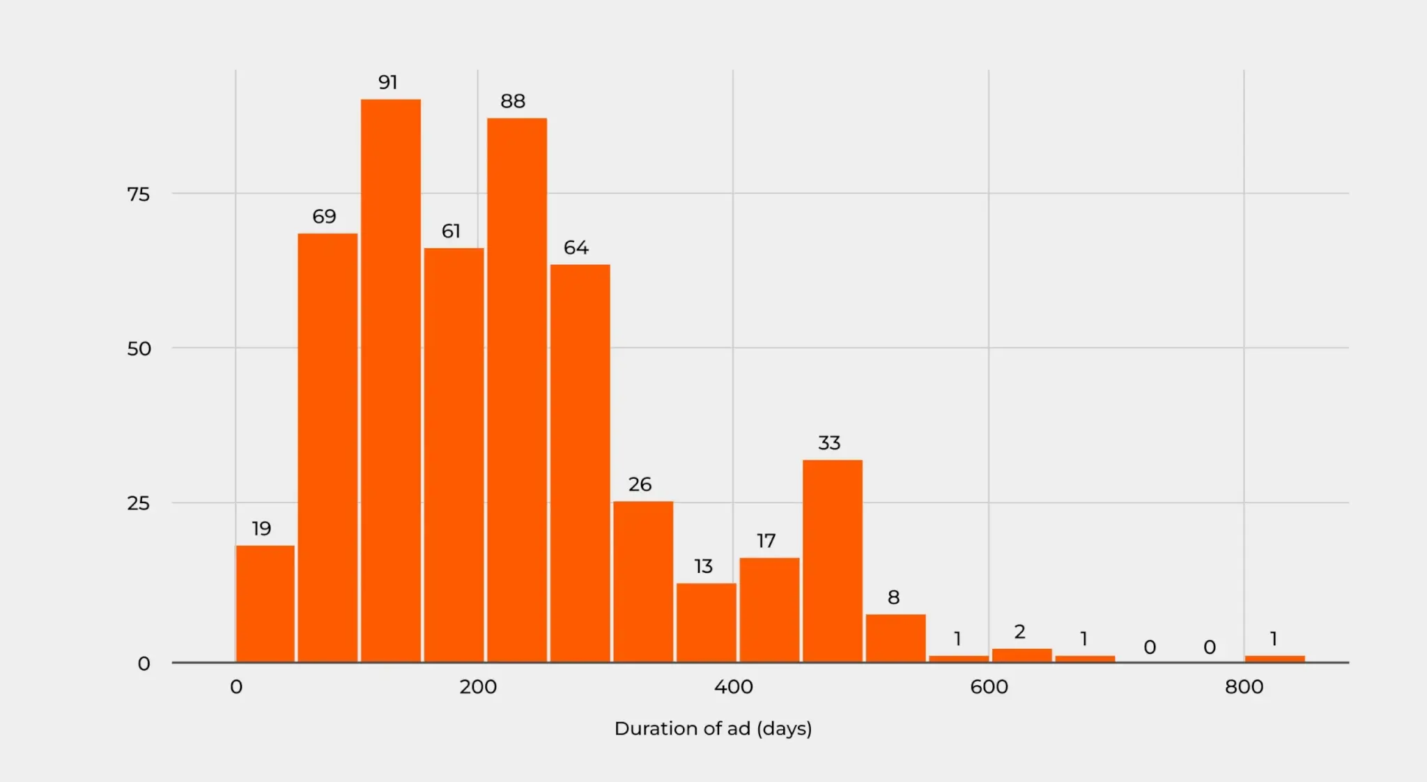 This allows us to quantify the impact of things like ad format, creative type, or landing page strategy on how long high-performing ads tend to run.