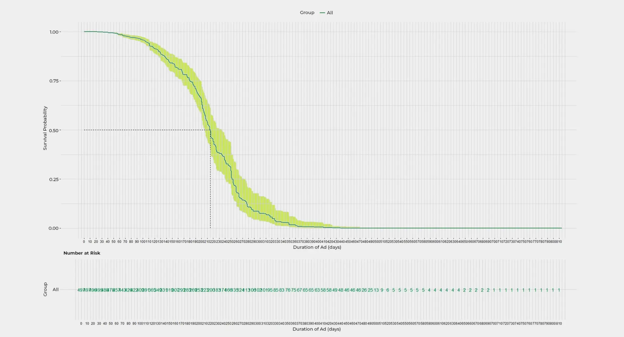 In our case, the “event” can be interpreted as the end of an ad campaign, but in other contexts, it might be things like product abandonment, program dropout, relapse, or even death.