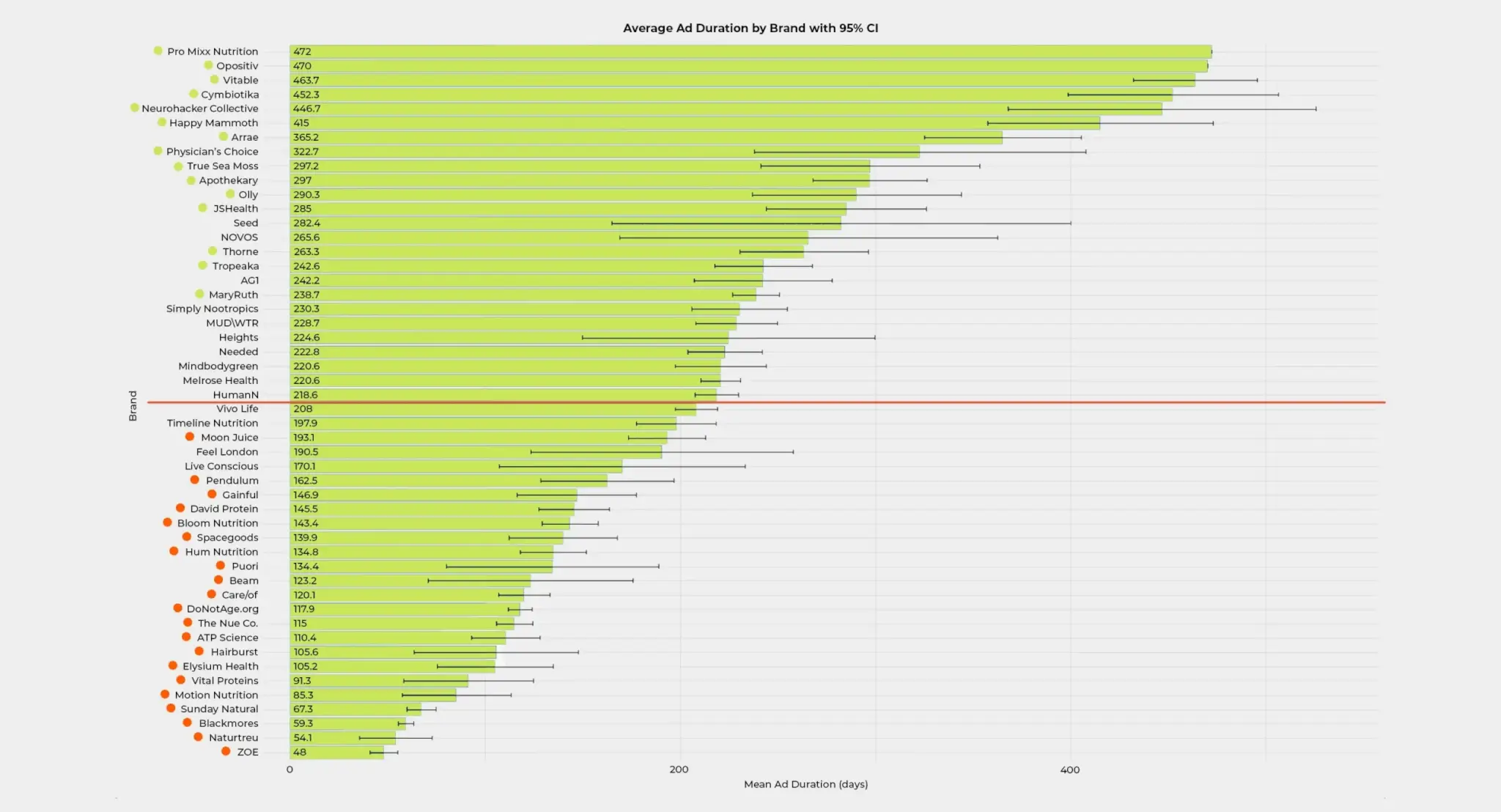 Brands like PRoMixx Nutrition, Opositiv, Vitable, Cymbiotika, Neurohacker Collective, and Happy Mammoth all cracked this code, keeping their campaigns alive for 400+ days.