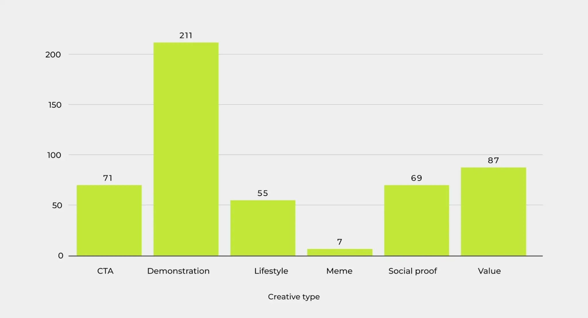 When it comes to creative styles, demonstration led clearly, 42.2% of all ads (211) focused on showing how the product works. These range from usage instructions to ingredient breakdowns.