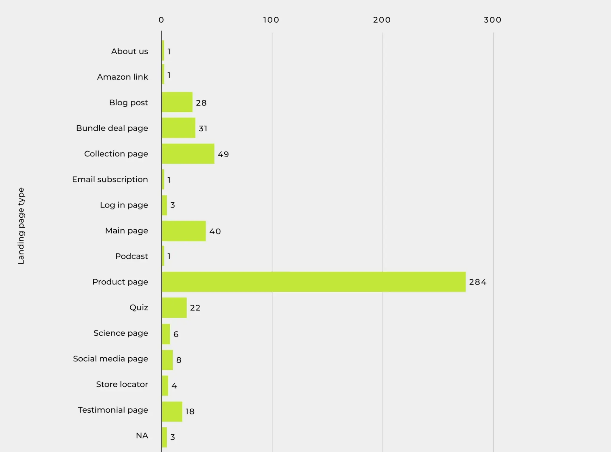 When it comes to supplement ad performance, where you send your traffic matters just as much as what you show. Our analysis reveals that Product Pages are the most frequently used destination, accounting for 56.8% of all landing pages. This highlights how many brands still opt for the most straightforward path to purchase.