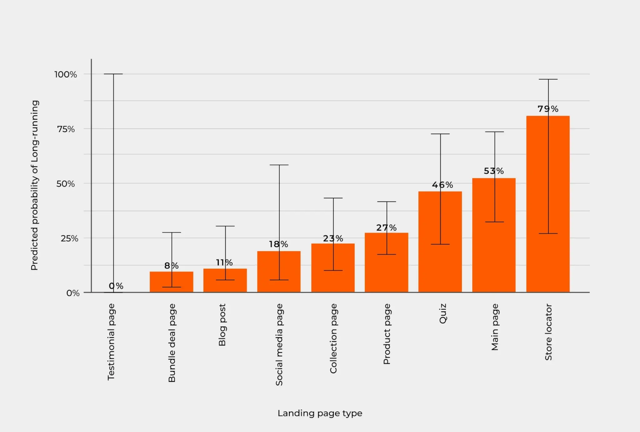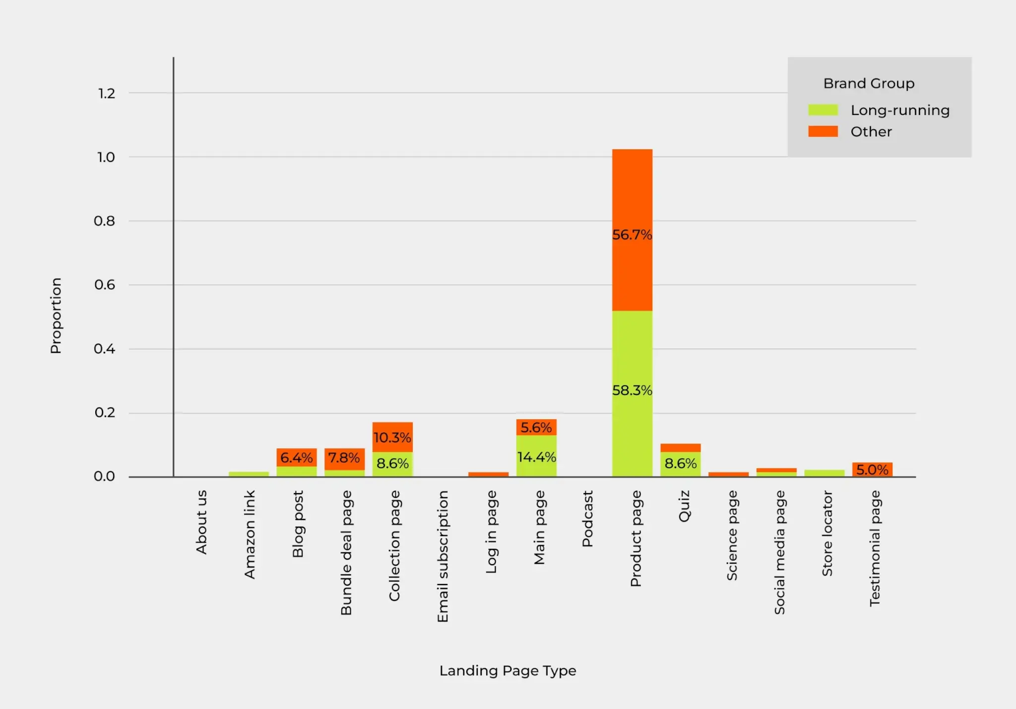 In the following visualization, you’ll see that brands with long-running ads lean heavily on product pages (58%) and main pages (14%). These choices drive consistency and clear brand experience, which appears to sustain campaigns over time. Other brands in our sample, on the other hand, spread their bets wider: they rely also heavily on product pages (56%), but also allocate traffic toward testimonial pages (5%), collection pages (10%), and blogs (7%).