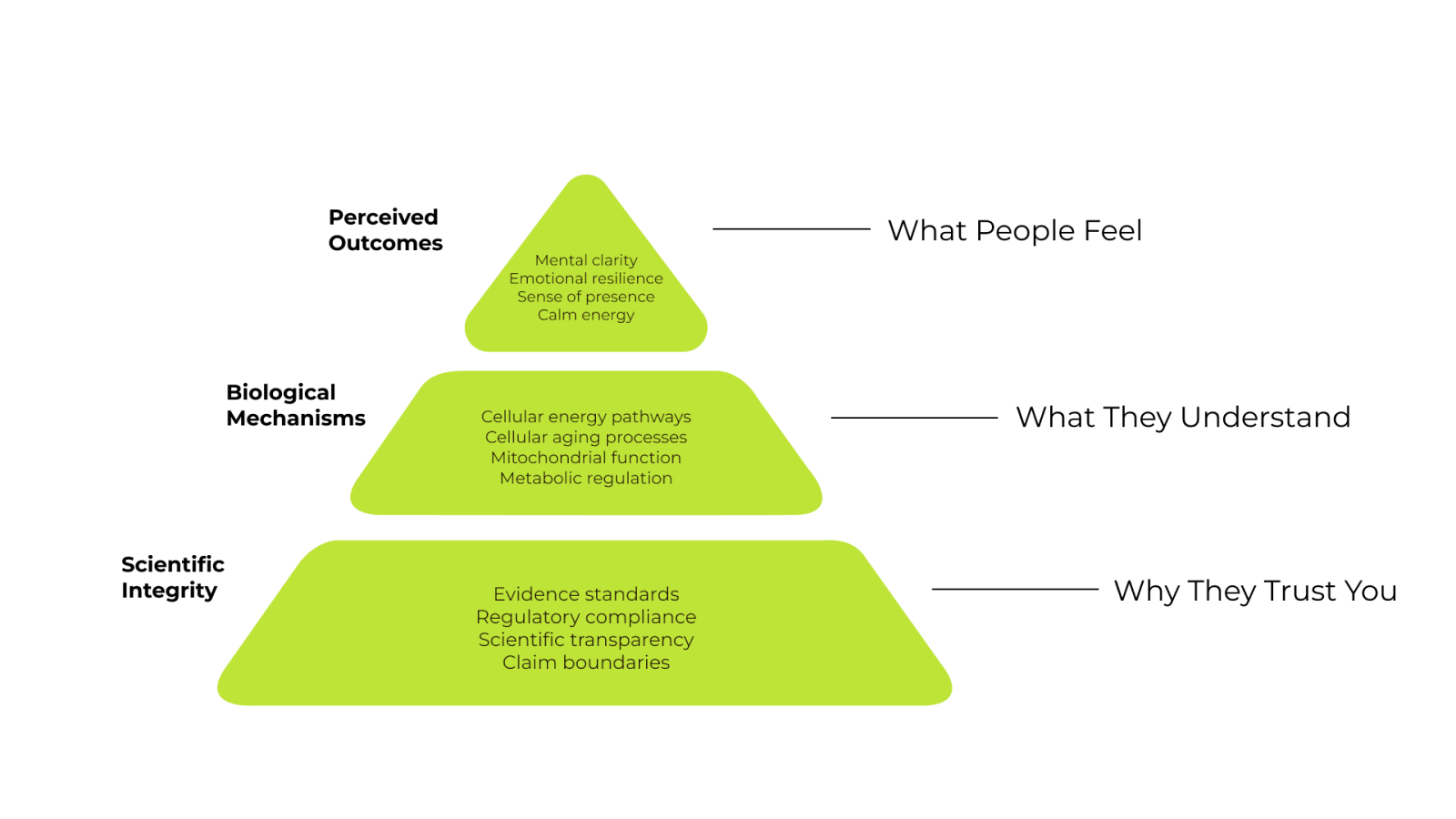 The strongest longevity brands are deliberately stepping away from outcome-heavy language (“anti-aging,” “reverse,” “clinically proven longevity”) and replacing it with mechanism-first explanation, what pathway, what biological process, what it’s involved in, and what it may support when applied consistently.