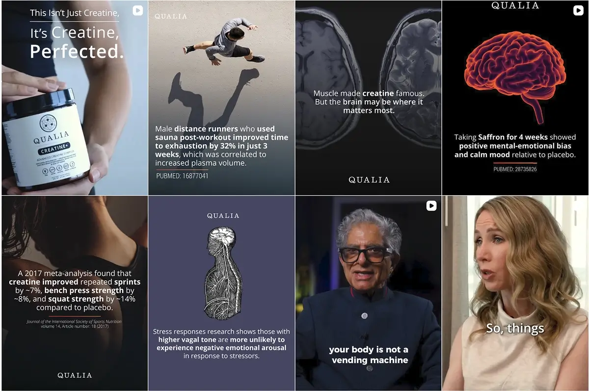 A good example of this dynamic is Qualia. Instead of leading with abstract longevity promises, they sell the identity outcome first: sharper focus, amplified drive, clearer thinking, basically “show up better on demanding days.” Their flagship cognitive product page is built around those high-performer payoffs (“focus,” “drive,” “energy,” “creative flow”), which plugs directly into the “discipline and edge” buyer mindset.