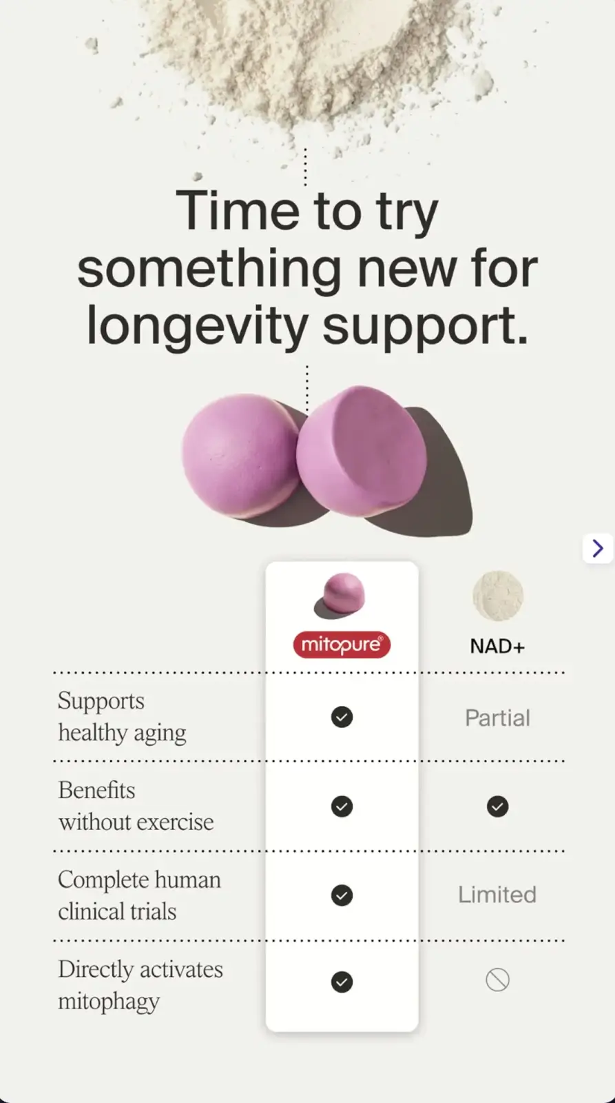 Timeline is a strong example of this “science-to-aesthetics” segment because they don’t try to sell beauty with vague vibes, they justify “aging well” with a clear mechanism story. They lead with cellular renewal and communicate more like a biotech company than a typical supplement brand, anchoring the brand around Mitopure® as a proprietary, clinically studied bioactive.