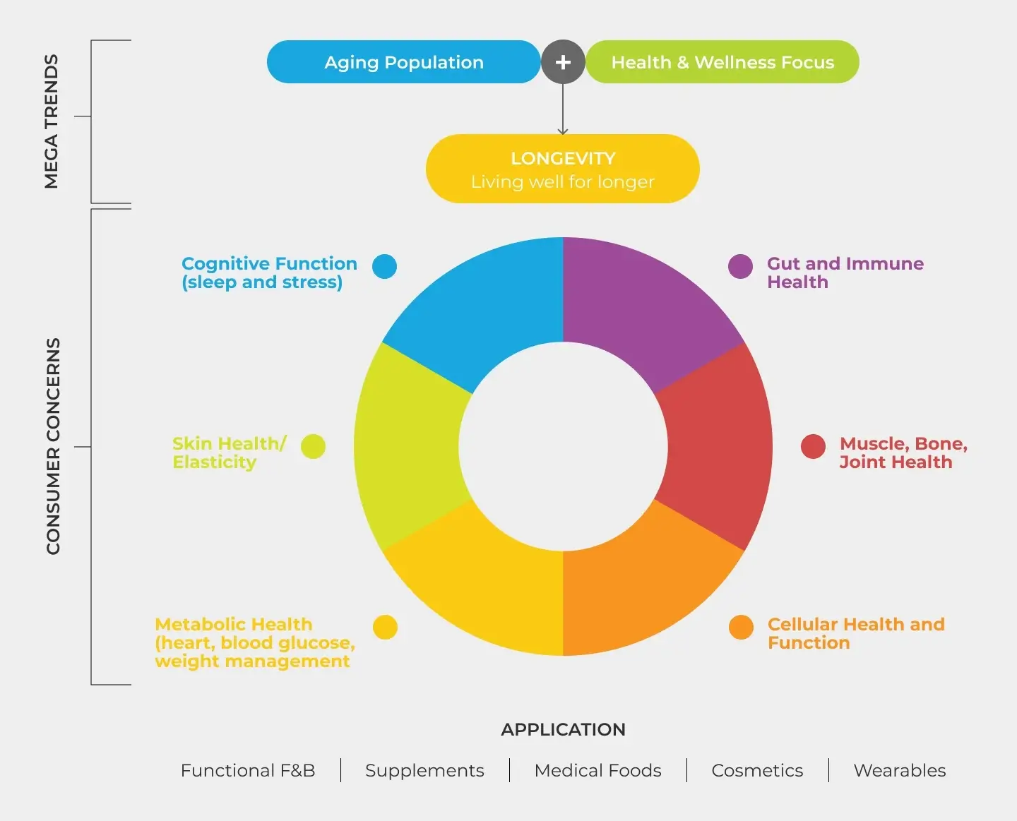 This chart illustrates how longevity – defined as living well for longer – is shaped by two macro trends: an aging population and growing health awareness